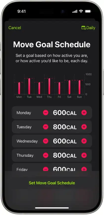 Apple Fitness allows you to set goals for each of your fitness metrics. For example, you might like to set a goal of 45 minutes of stretching, 30 minutes of walking, 15 minutes of running, and 10 minutes of meditation every day. The Fitness app will show you your stats based on your goals. To do this, tap the pie charts to open them, then scroll down and tap the Change Goals button.