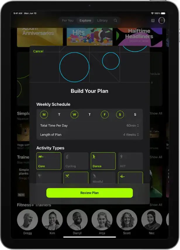 You can create a workout plan based on your needs using the suggestions and workouts available in Fitness+. Apple Fitness+ workout plans include days of the week, start and end times, workouts, and the length of each workout. This way, Fitness+ will suggest regular daily routines for you based on the workouts or meditations you can do. To create a plan or workout plan in Fitness+, follow these steps: