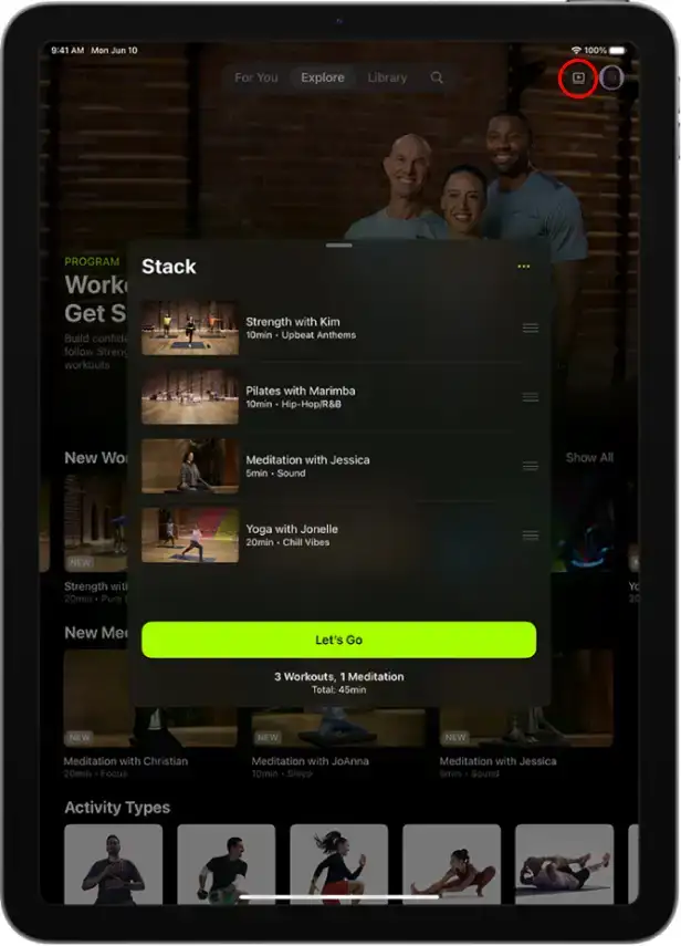 anywhere in Fitness+ to open your Stack. Now tap the Let's Go button to play the workouts in the Stack in order. After each workout, tap the Let's Go button again to play the next workout, or tap Done to close the Stack.