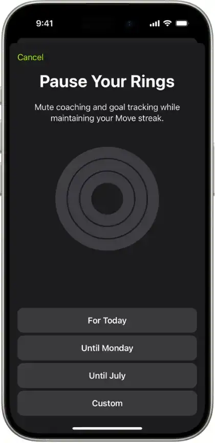 If you plan to or have to stop your workout routine for a while—for example, if you go on vacation or get injured—you can pause your activity tracking in Apple Fitness for between 1 and 90 days. This way, your stats won't be affected. To do this, just tap the ring charts and tap the Pause Rings button at the bottom of your stats page. Then choose the length of time you want.