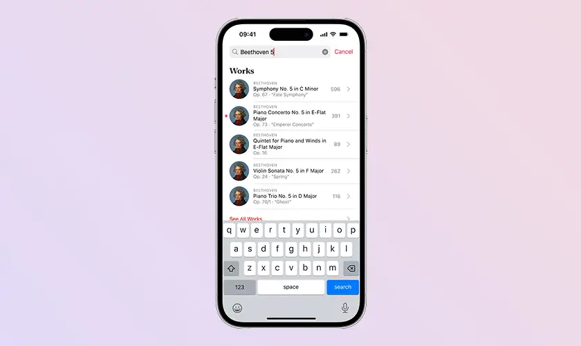 یکی از نقاط قوت Apple Music Classical موتور جستجوی دقیق آن است. برخلاف اپل موزیک که بیشتر به سبک، هنرمند و آلبوم توجه دارد، این اپلیکیشن امکان جستجو بر اساس ساز، ارکستراسیون، حالت (Mood)، دوره تاریخی (Baroque، Romantic...) و سرعت (Tempo)، آهنگساز (Composer) و... را فراهم می کند. اگر دنبال قطعه ای برای ریتم تنفس ۶-۶ یا تمپو ۶۰ تا ۷۰ هستید، این قابلیت جستجو دقیقاً برای شما طراحی شده است.