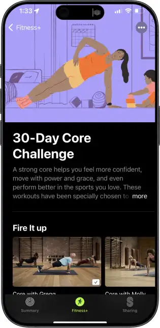اپل فیتنس پلاس یک برنامه ی ۳۰ روزه تحت عنوان "30-Day Core Challenge" دارد که مخصوص لاغری شکم طراحی شده است. هر روز تمرینی ۱۰ تا ۲۰ دقیقه ای انجام می دهید که تمرکز آن بر تقویت عضلات شکم، افزایش استقامت و چربی سوزی ناحیه میانی بدن است. این برنامه را می توانید از تب Collections در اپلیکیشن Fitness روی آیفون یا آیپدتان انتخاب کنید. از مزایای این چالش آن است که نیاز به تصمیم گیری روزانه درباره اینکه چه تمرینی انجام دهید ندارید؛ فقط کافیست ویدیوی تمرین همان روز را باز کرده و شروع کنید.