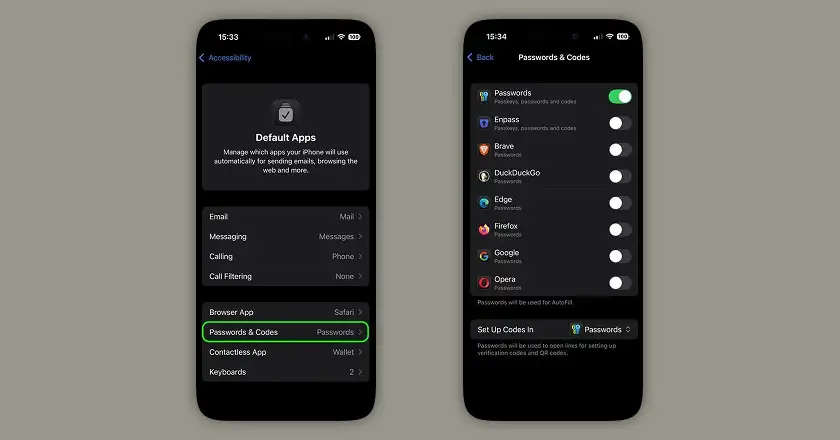 - حالا لیستی از برنامه هایی که می توانند کار آن بخش (در اینجا Passwords & Codes) را انجام دهند می بینید. برنامه ی مورد نظر خود را از این لیست انتخاب کنید تا تغییرات ذخیره شود. مثلا ما Google Passwords را انتخاب کرده ایم.
