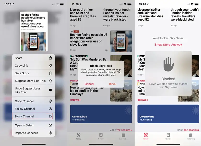 - در تب Today، مقاله هایی که دوست ندارید و از منابع ناخواسته هستند را پیدا کنید.