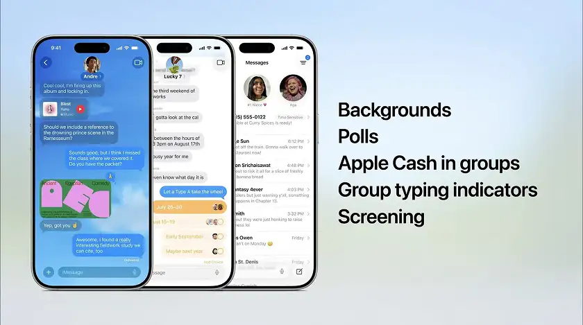 اپلیکیشن Messages هم با قابلیت هایی مانند پس زمینه های قابل شخصی سازی برای چت ها، برگزاری نظرسنجی در چت های گروهی و استفاده از Apple Cash در گروه ها به روز رسانی شده است. کاربران همچنین می توانند پیام های ناخواسته از فرستندگان ناشناس یا اخیر را فیلتر کنند. قابلیت Genmoji هم هوشمندتر شده و امکان ترکیب و سفارشی سازی اموجی ها را فراهم می کند. افزون بر این، سبک های جدید ChatGPT، مانند نقاشی رنگ روغن یا درخواست سبک های خاص، به بخش Image Playground در این اپلیکیشن اضافه شده است.